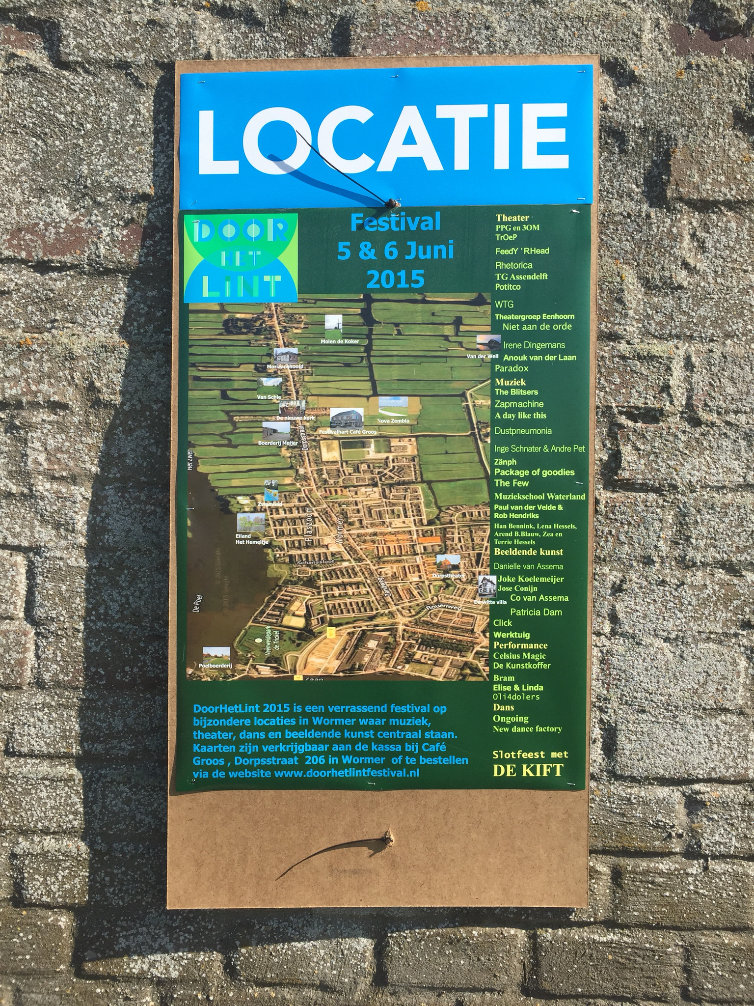 Performance Art, DoorHetLint Festival 2015 - The Door is Open - Elise + Linda Spel in landschap van de mens en zijn object. Linda Willemszoon (illustrator) + Elise Fernandez (actrice) Art-performances op locatie. "The Door is Open" is een combinatie van kunst en theater. Mensen zijn altijd overal verbonden en zelfs bij een disconnectie zijn we online. Het gaat over de dagelijkse sleur en connectie maken en verliezen. Dit deden we via draden in een beeldend spel. Dit ritueel herhaalden we tijdens DoorHetLint Festival op twee locaties. Locatie's: - Molen De Koker - 5 juni 20.00 - 20:30 uur ( Oosteinde 14, 1531 KD Wormer ) - Schuur Van der Well - 6 juni 16.30 - 17:00 uur ( Engewormer 33, 1531 MX Wormer ) http://www.doorhetlintfestival.nl/